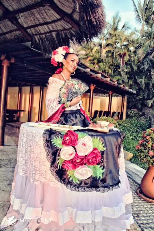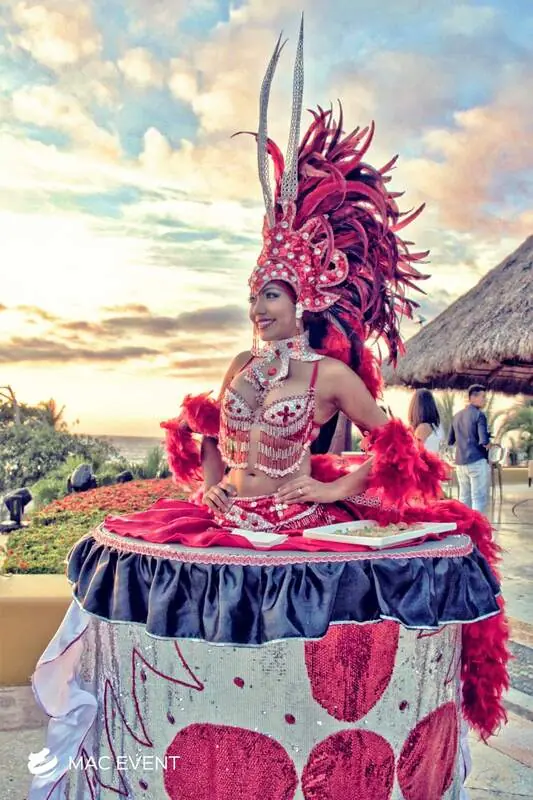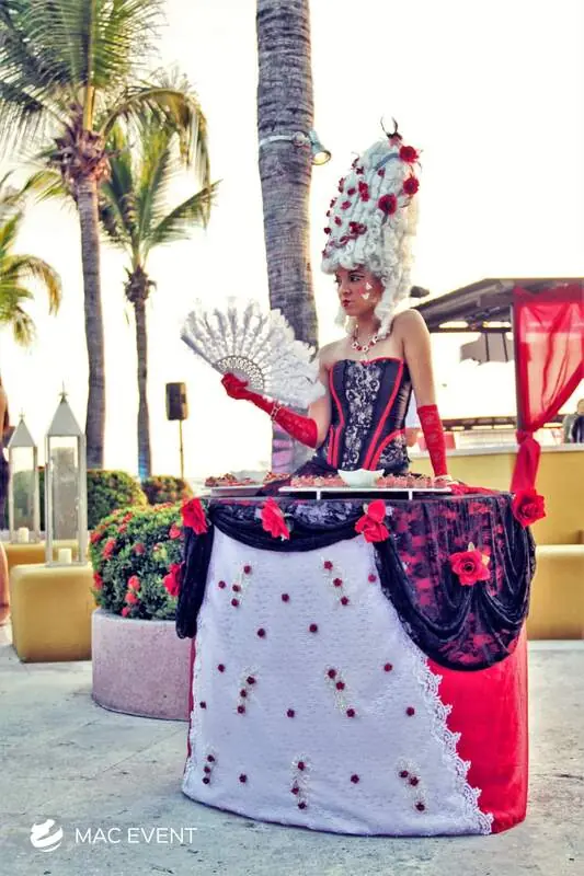 The strolling tables add creativity and elegance to weddings, parties, and corporate events in Zihuatanejo. Performed by entertainers wearing beautifully designed costumes with built-in tables, this event entertainment rental offers a unique way to serve drinks, appetizers, or favors. The strolling tables move gracefully among guests, combining functionality with visual impact and interactive charm. Renting strolling tables in Zihuatanejo ensures professional performers, stunning presentation, and seamless coordination with your event theme. For a stylish and unforgettable experience that delights guests, the strolling tables are a perfect addition to any celebration.